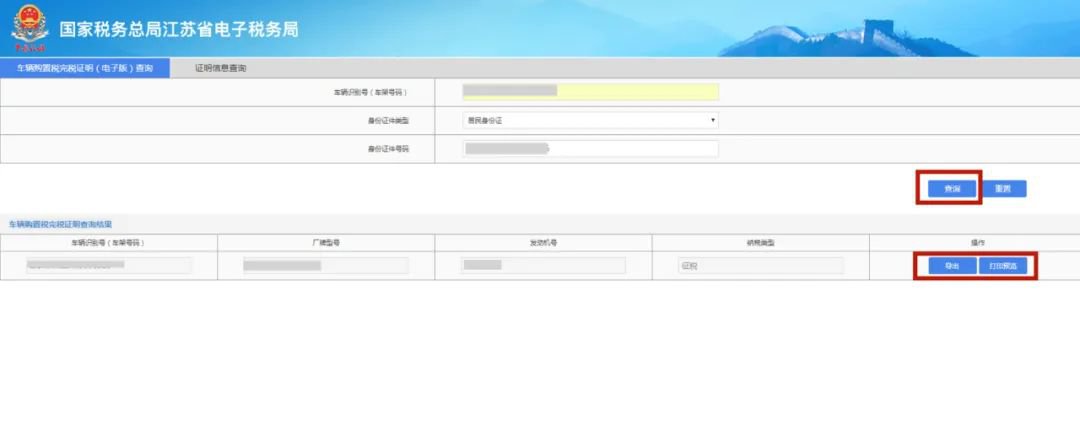 车主可通过江苏省电子税务局“公众服务”—证明信息查询—输入“车架号、证件号码”—“打印预览”,查询或打印完税证明。