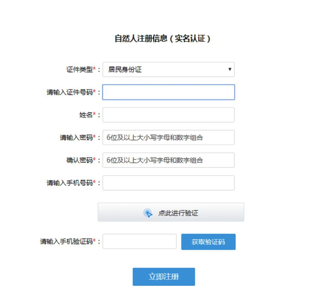 输入正确的姓名、证件号码、电话号码并设置密码后,手机接收验证码,即可完成注册。