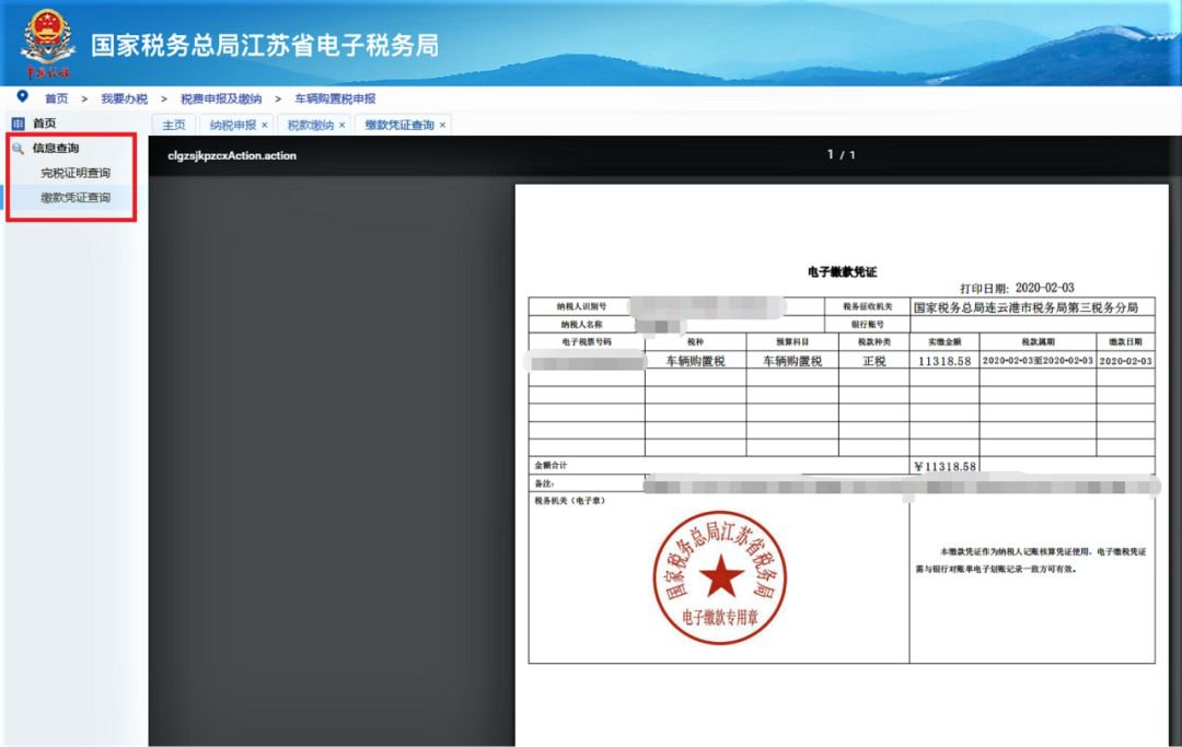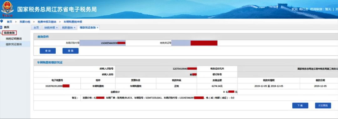 交款成功即完成车购税缴纳,可直接前往上牌。如需查看完税凭证,可点击左侧功能栏“信息查询”界面,输入“车架号”,即可查询或打印电子缴款凭证及完税证明。