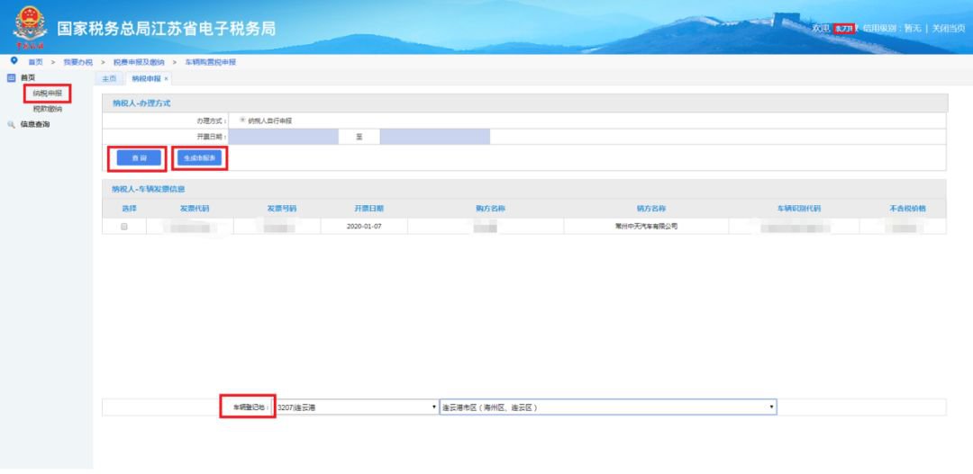 选择左侧功能栏“纳税申报”,点击“查询”,便可带出该纳税人名下待申报的车辆信息。核对名称、发票号码、车架号等信息与实物是否一致。然后按实际上牌地,选择界面下方“车辆登记地”的市、区县信息,随后点击“生成申报表”。