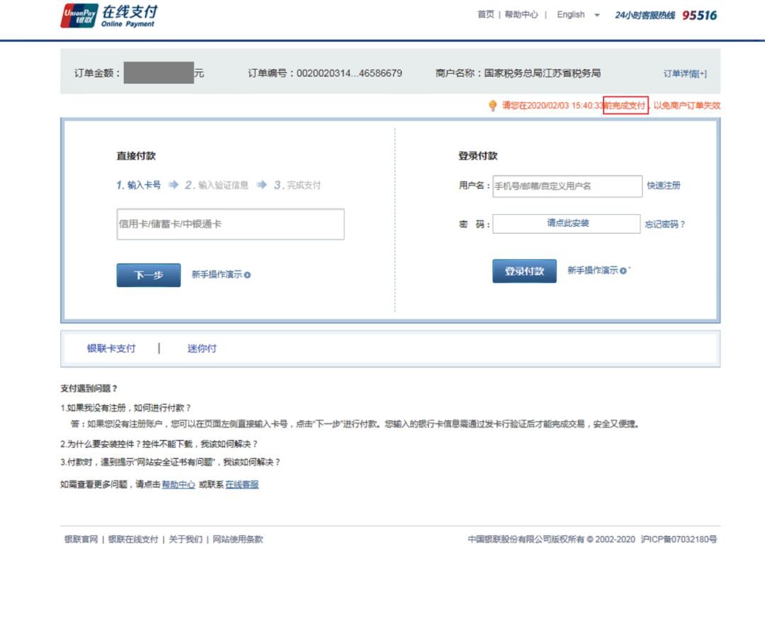 选择“银联支付”的自然人将跳转银联网上划卡界面(首次运用银联缴款的电脑需点击安装控件),请在右上角提示时间之前完成支付。