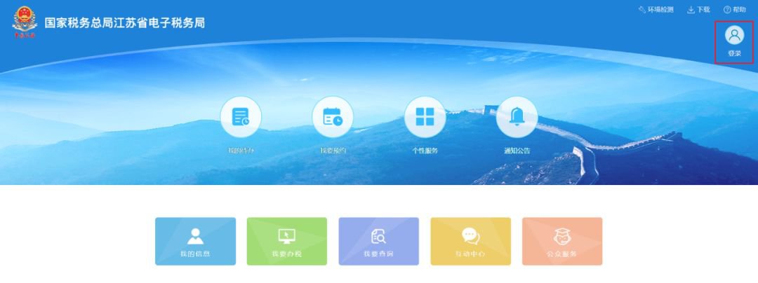 搜索“江苏省电子税务局”,或直接登陆:https://etax.jiangsu.chinatax.gov.cn/sso/login,点击右上角“登陆”。