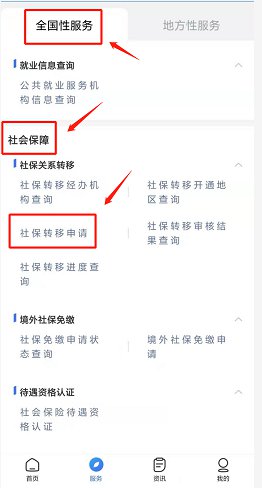 第三步:选择“全国性服务”—“社会保障”—“社保转移申请”