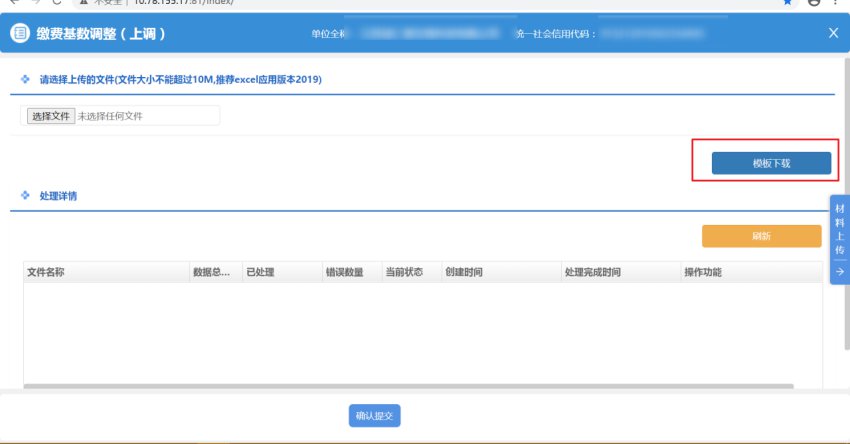 第五步:在模板上维护参保人员的新基数,点击【选择文件】按钮,选择需上传的模板,点击确认提交,完成业务办理。
