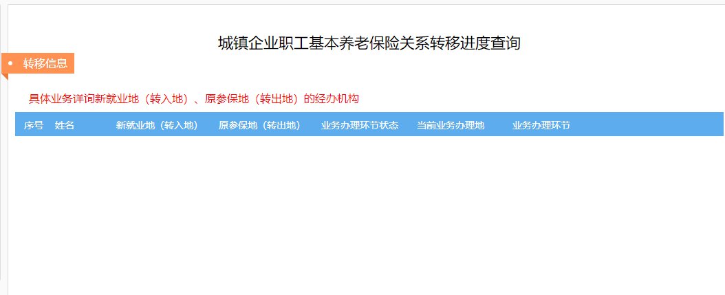 第四步:页面显示的即为转移进度,具体业务详询新就业地(转入地)、原参保地(转出地)的经办机构,如下图所示;