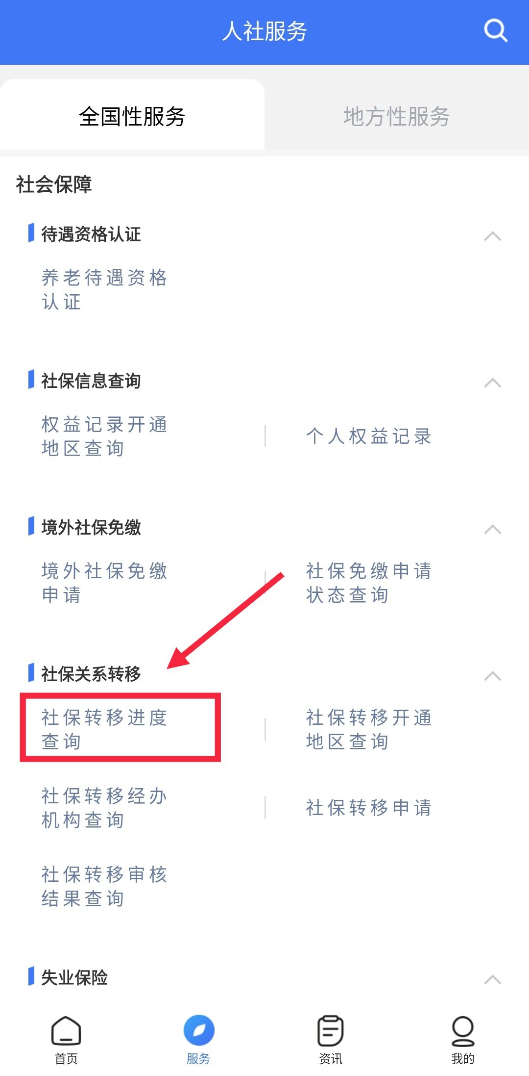 第三步:在【全国性服务】中找到【社保关系转移】,并点击【社保转移进度查询】,如下图所示;