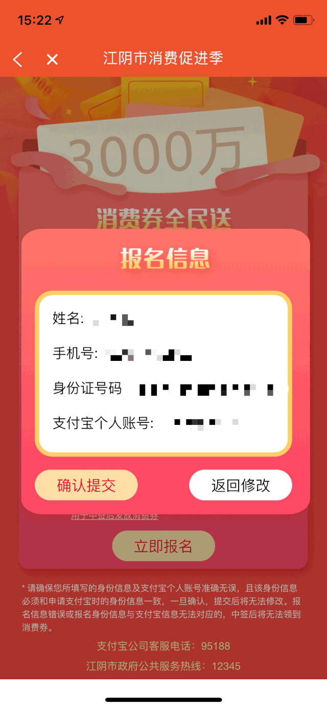 用户报名时间:4月21日12:00——4月26日12:00消费者通过“最江阴”APP下载注册并预约报名,准确填写个人信息(身份信息需与申请支付宝时的身份信息一致)。
