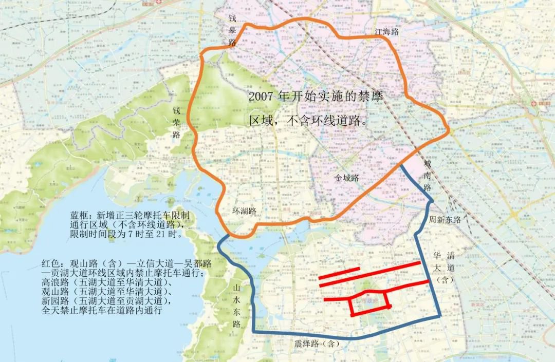 山水东路、震泽路(含)、华清大道(含)、周新东路、城南路、金城路、金城西路、环湖路、双虹桥构成的环线以内道路每天7时至21时禁止正三轮摩托车通行。