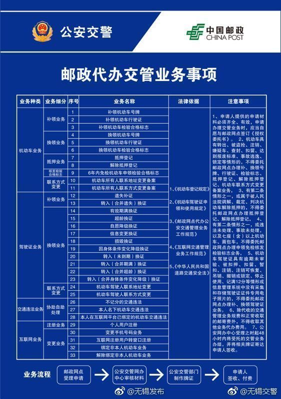 选择就近邮政网点→提交相关材料、邮政窗口受理业务、申请人回家→交警网办中心办理相关业务、制作牌证、并交邮政部门在48小时内寄达申请人→申请人签收