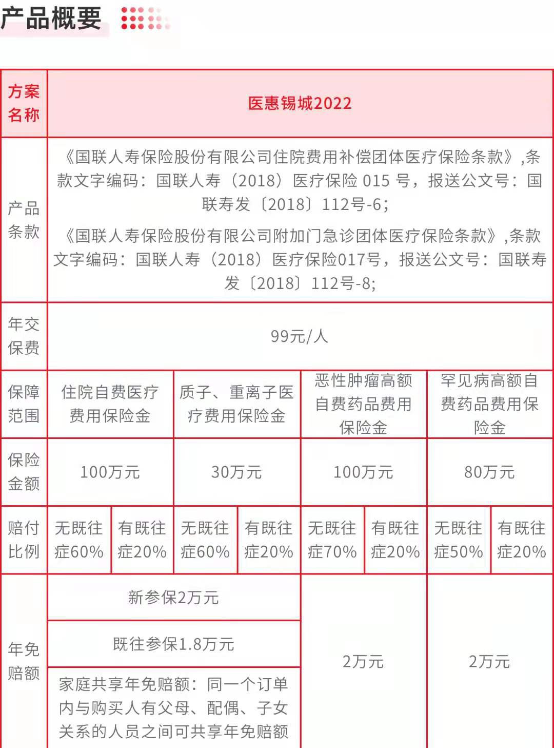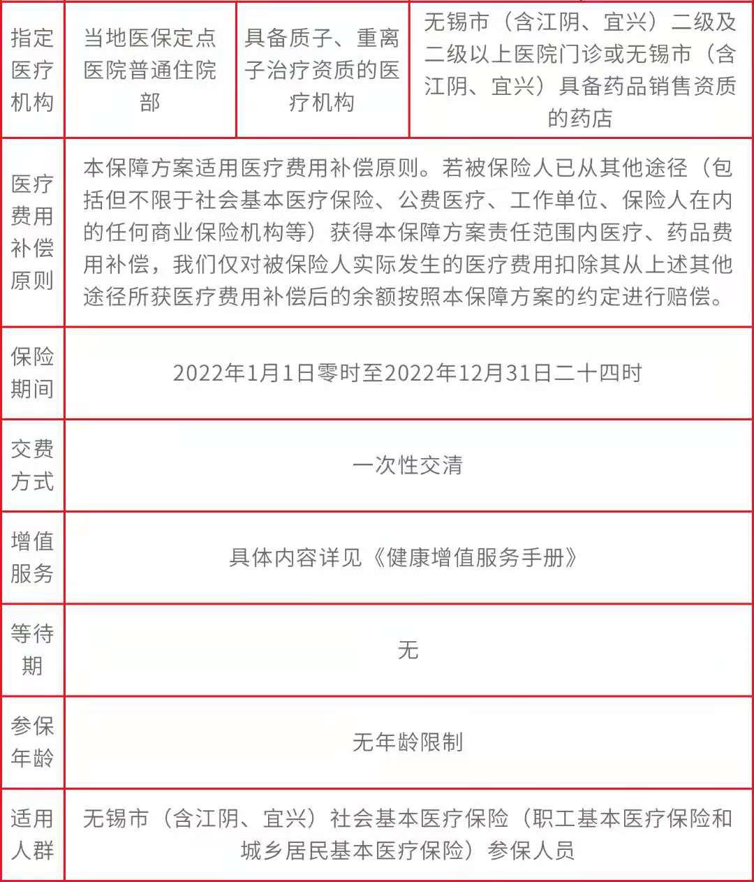 在保险期间内,被保险人因疾病或意外伤害在当地医保定点医院普通住院部住院治疗的,发生的合理且必要的经无锡(含江阴、宜兴)社会基本医疗保险结算后的住院自费医疗费用,扣减年免赔额后,无重大疾病既往症人群按60%给付保险金,重大疾病既往症人群按20%给付保险金。