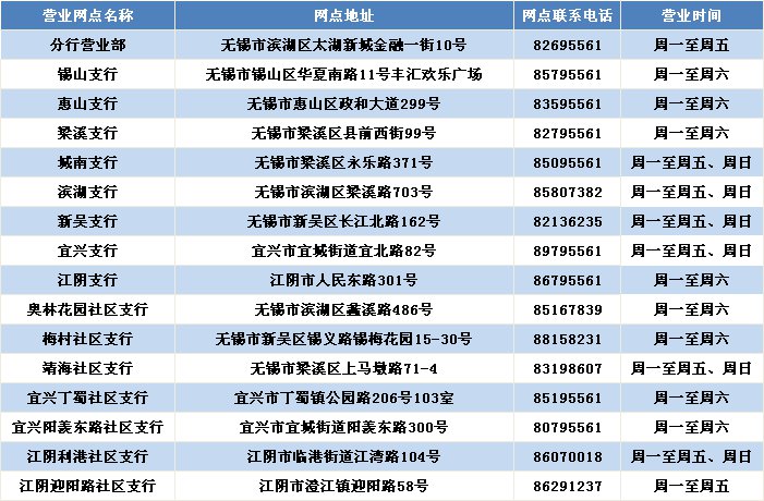 兴业银行无锡分行网点地址及电话