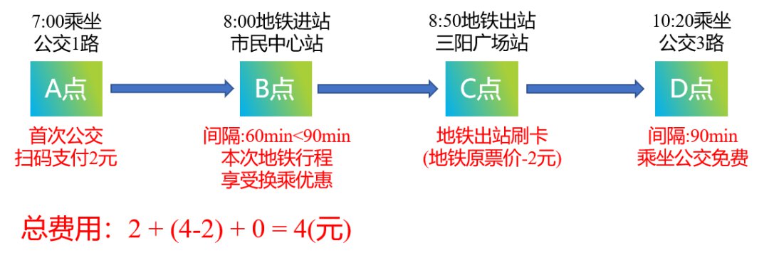 该次出行中,该乘客于7:00支付金额2元(扫码乘车按原票价扣款),于8:50支付2元(本次地铁进站扫码与上次公交扫码时间间隔60分钟,享受换乘优惠,支付金额为4元-2元),于10:20支付0元(本次公交扫码与上次地铁出站扫码间隔90分钟,享受换乘优惠)。
