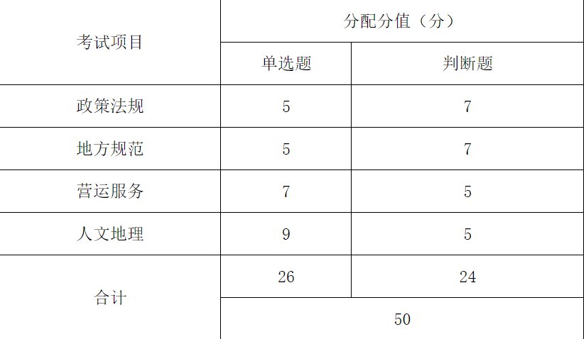 (三)区域科目考试试题共50道,题型分为判断题、单项选择题,其中,“巡游车”判断题23题,每题1分,单项选择题27题,每题1分;“网约车”判断题24题,每题1分,单项选择题26题,每题1分。