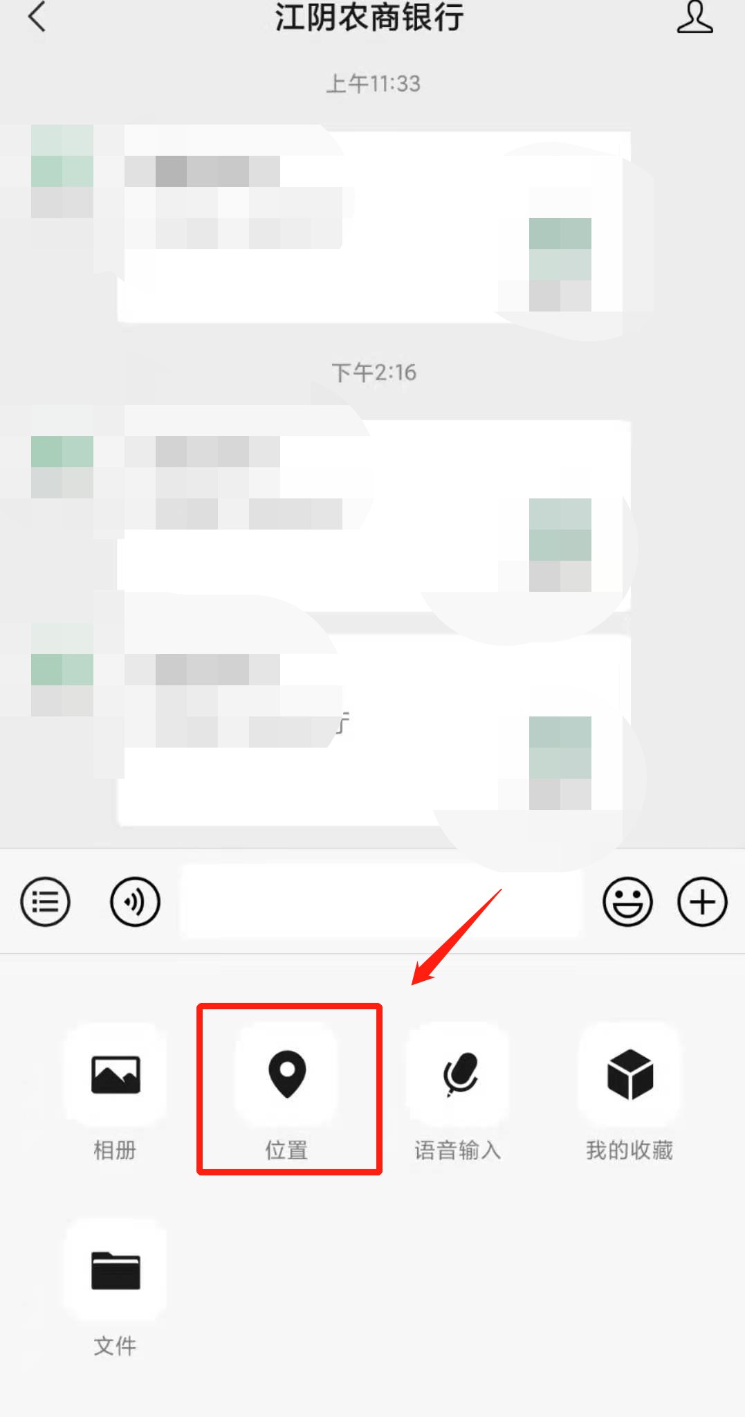1、微信关注“江阴农商银行”,点击对话框,点击发送“位置”