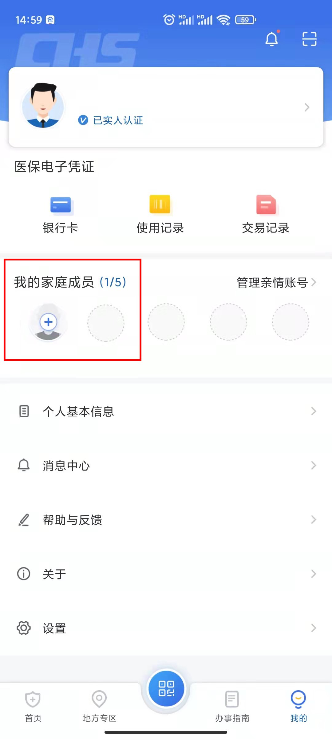 4.添加亲情账户后,可以在个人中心页面的“我的家庭成员”板块看到已添加的家庭成员。点击家庭成员的头像,就能查询使用该成员的医保电子凭证。