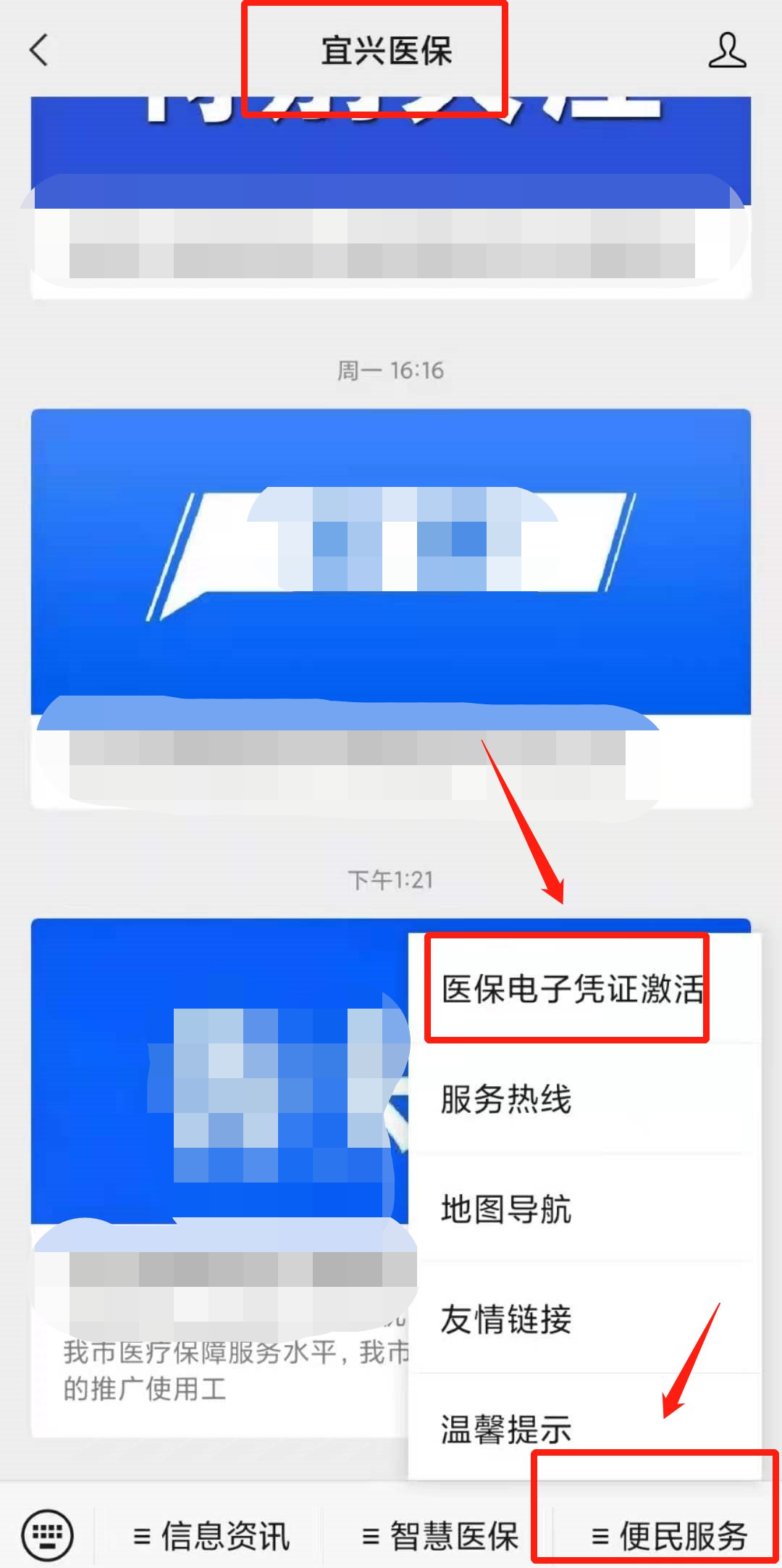 1、关注“宜兴医保”微信公众号,点击右下方菜单栏“便民服务”中的“医保电子凭证激活”菜单,按提示激活。激活后,可在微信“我”-“卡包”-“票证”中查看或使用。