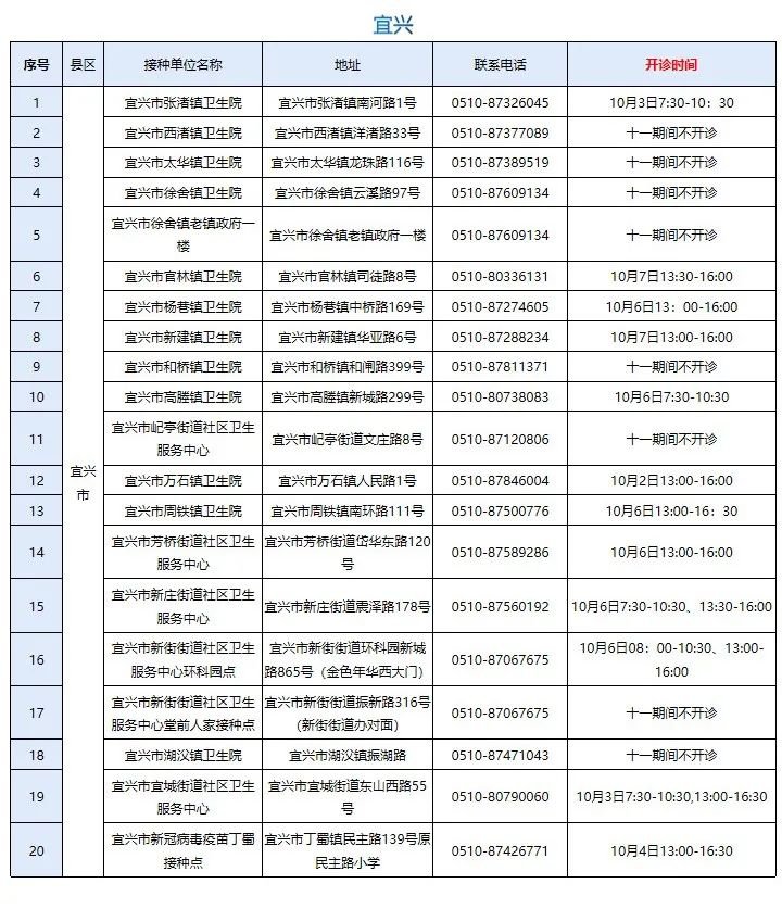 为满足广大居民接种新冠疫苗需求,确保国庆期间接种工作安全、有序进行,10月1日-7日国庆假期期间,无锡新冠疫苗接种门诊安排如下: