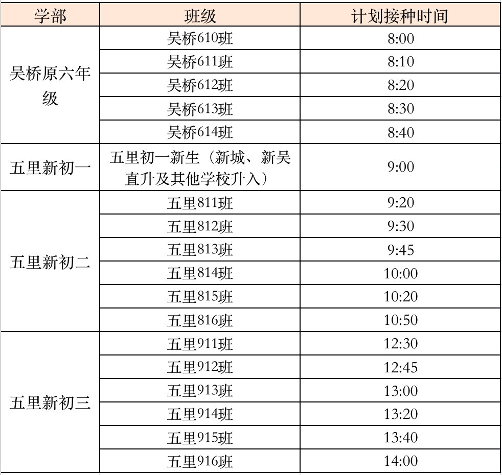 没有参加过新疫苗接种的学生也可以参加第一针接种,第一针新冠疫苗接种后间隔21-56天都可以参加第二针接种。特别提醒:新城校区、新吴校区直升五里校区的初一学生,请参加8月28日的第二针次接种。