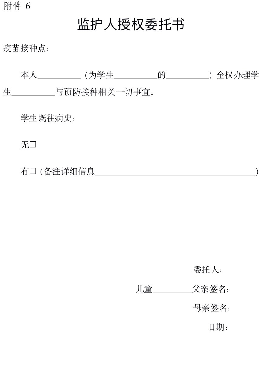 3、如果接种当天监护人不能到现场,需要提前自行打印《监护人授权委托书》,并按照要求填写既往病史,签字委托,将委托书带到接种现场交给班主任。被委托的人必须是成年人。