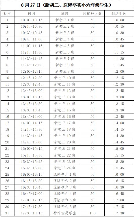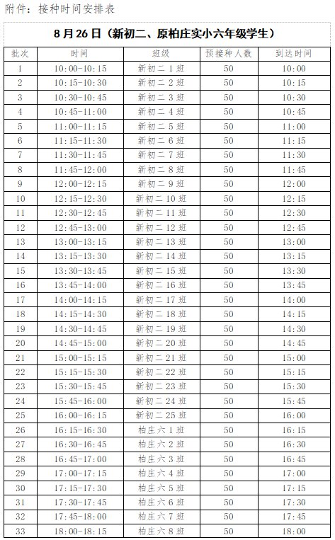 由东亭街道社区卫生服务中心到锡山八佰伴临时接种点(水景瀑布旁)集中为学生接种疫苗,第二针接种时间:2021年8月26日—8月27日,各班具体接种时间安排表详见附件。