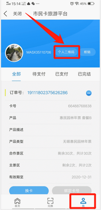 刷码入园:二维码打开方式:打开“无锡市民卡”APP/无锡市民卡微信公众号--惠民园林年票--我--个人二维码扫码验票入园;