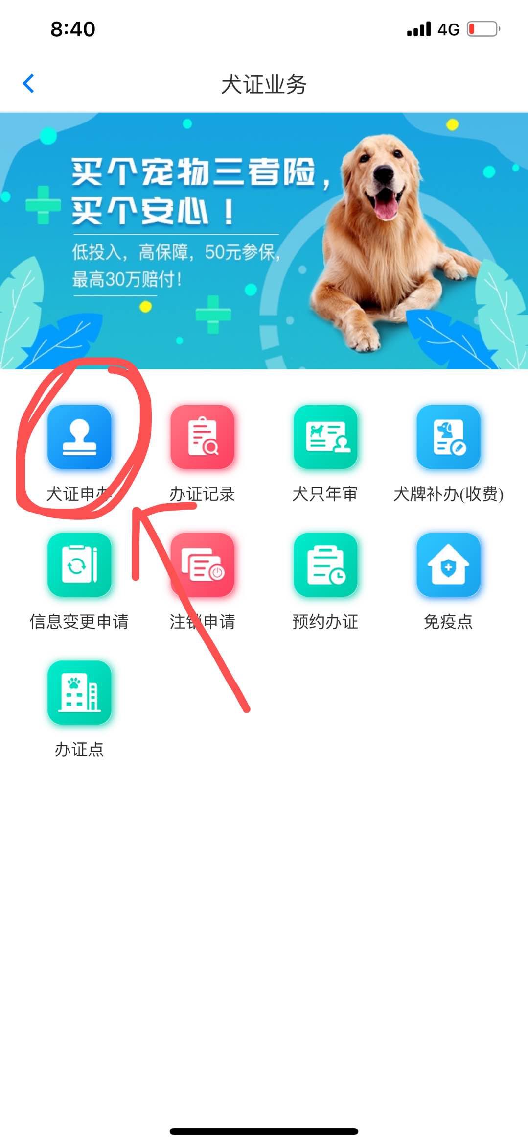3、在首页点击“犬证在线申办”