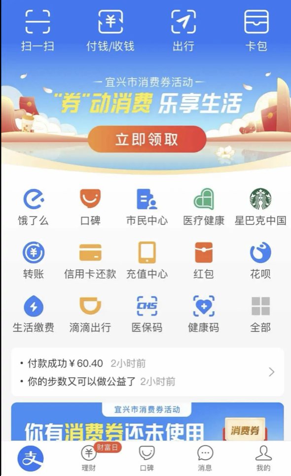 采用支付宝发放,在发放时间段打开支付宝首页,进入“宜兴消费券”专用抢券通道。