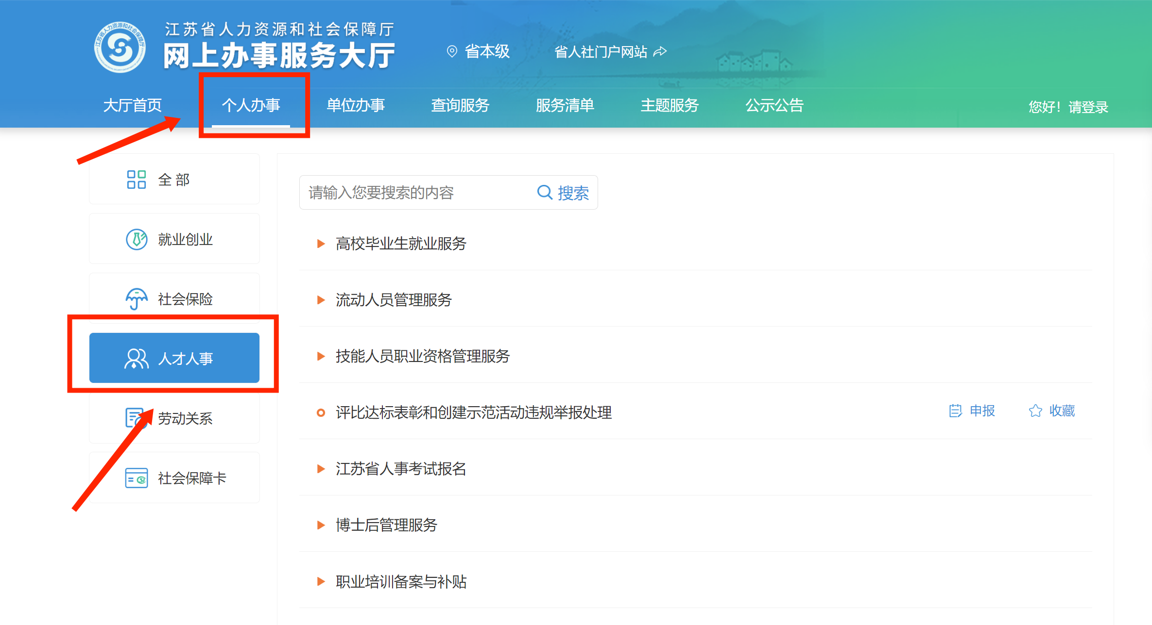 1. 登录江苏省人力资源和社会保障厅网上办事服务大厅,选择“个人办事”,点击“人才人事”