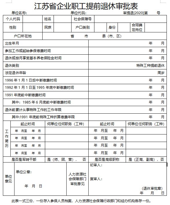 江苏省企业职工提前退休审批表下载入口: