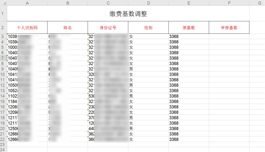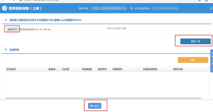 4.在模板上维护参保人员的新基数,点击【选择文件】按钮,选择需上传的模板,点击确认提交,完成业务办理。