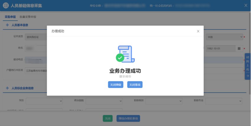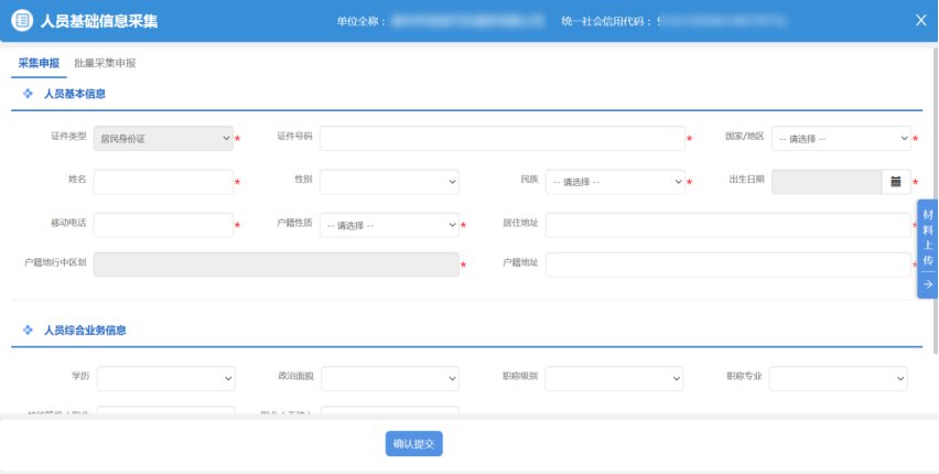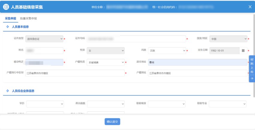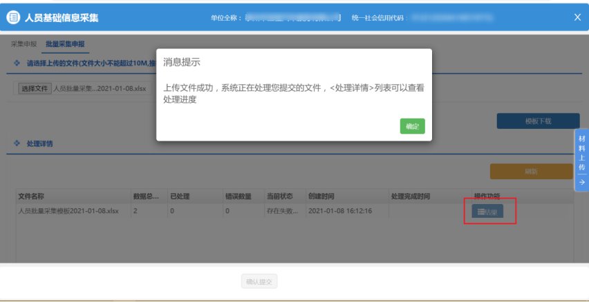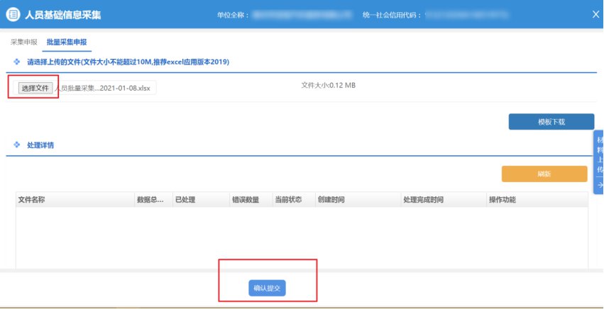 6.在模板上维护需要导入的人员信息,点击【选择文件】按钮,选择需上传的模板,点击确认提交,完成业务办理。