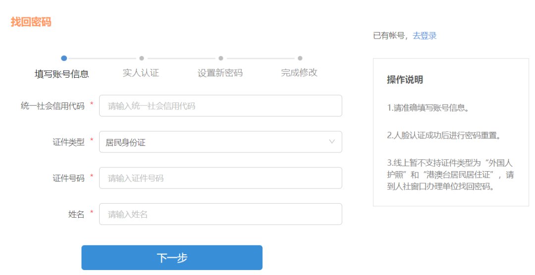 1. 单位经办人在互联网网办大厅登录时忘记密码,通过找回密码引导找回密码。