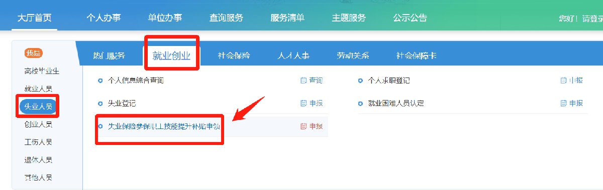 二、点击左侧“失业人员”一栏,再点击“就业创业”,选择“失业保险参保职工技能提升补贴”一栏,进行申报。