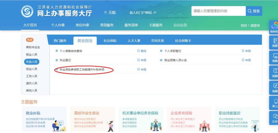 线上申领:登录江苏省人社网上办事服务大厅(https://rs.jshrss.jiangsu.gov.cn/index/),进入“大厅首页”,点击左侧“失业人员”一栏,再点击“就业创业”,选择“失业保险参保职工技能提升补贴”一栏,进行申报。