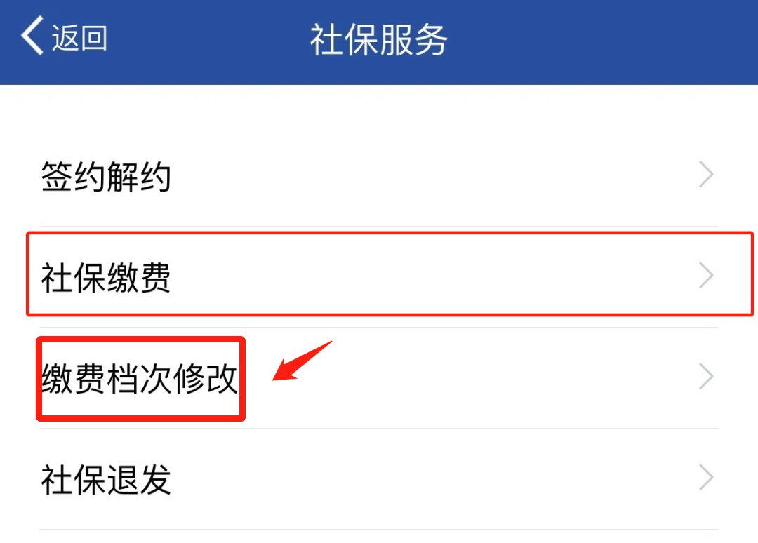 2.选择【社保缴费】,输入缴费人证件类型、证件号码和姓名,点击【查询】,选择【缴费档次修改】即可。