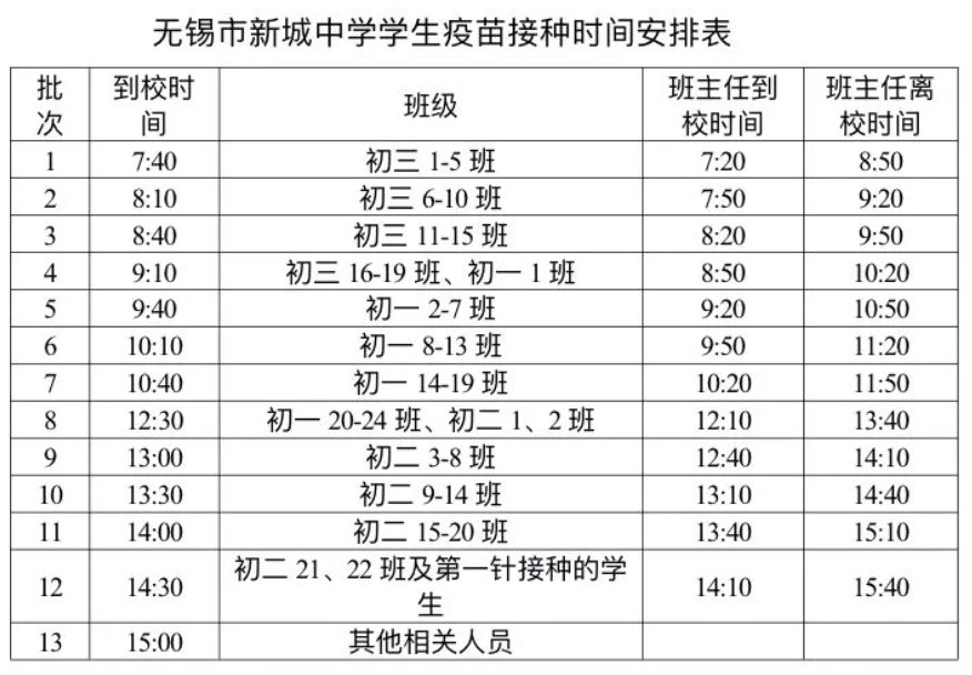 由江溪街道社区卫生服务中心到新城中学,为学生集中接种疫苗。各班具体接种时间安排详见下表。