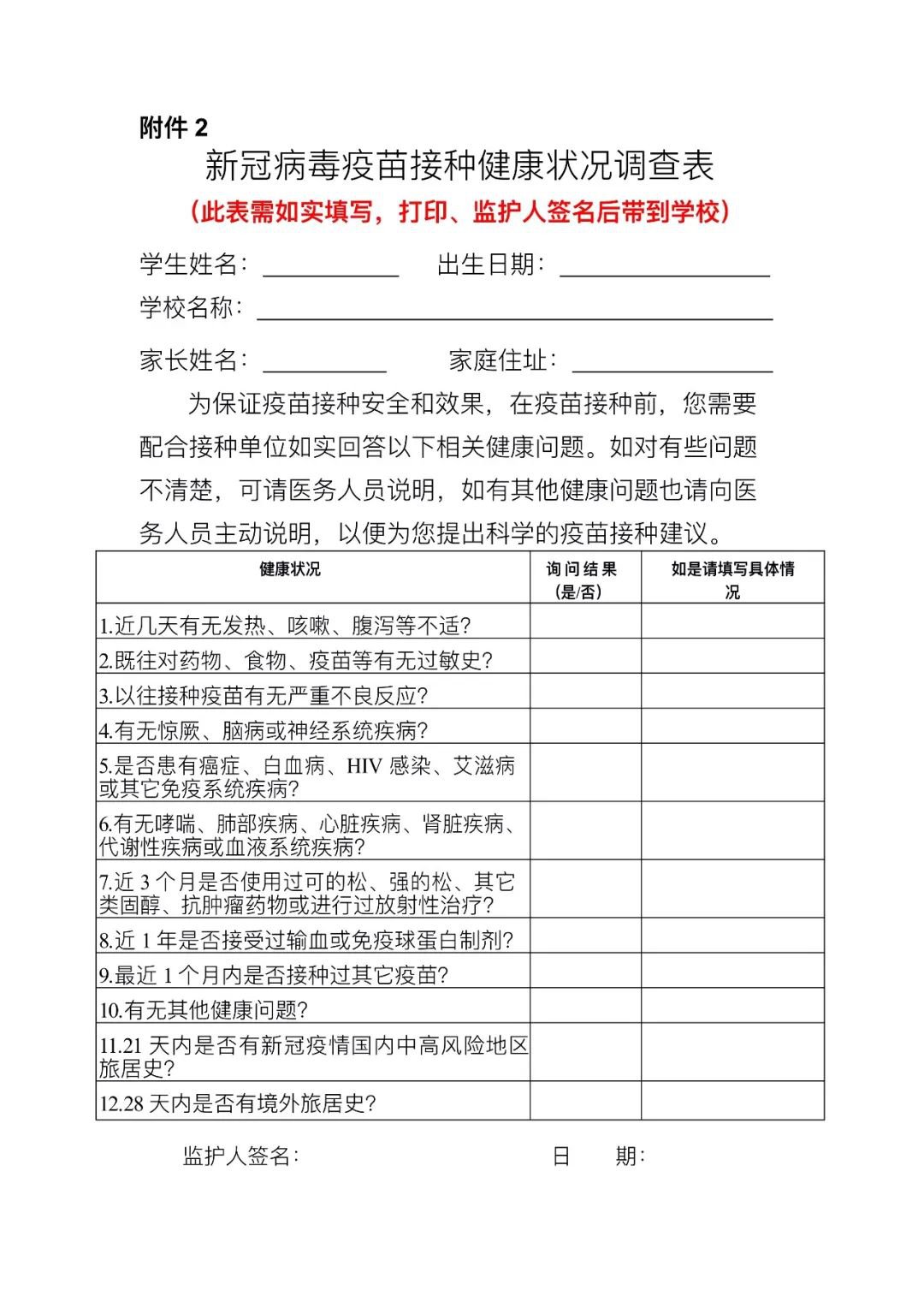 3.请您提前打印并填写《新冠病毒疫苗接种健康状况调查表》,当天将签好字的调查表带至学校。