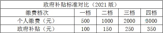 2021年度城乡居民基本养老保险个人缴费标准:每人每年500元、1000元、2000元、3000元四个档次,其中每人每年500元的缴费档次仅面向低保、重残等缴费困难人员,由政府给予全额补贴。