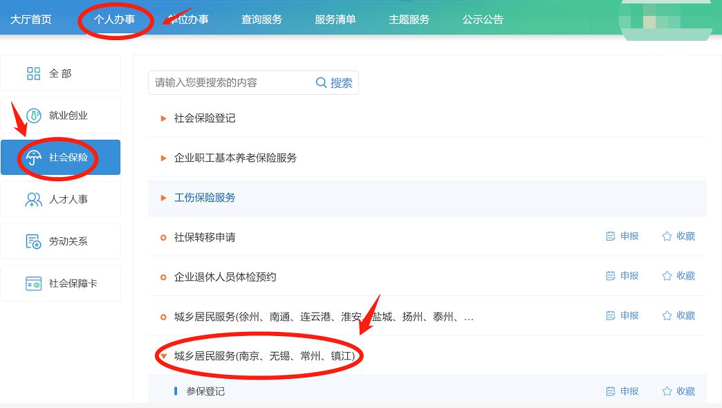 步骤二:点击“个人办事”,选择界面左边的“社会保险”,对应右侧出现“城乡居民服务(南京、无锡、常州、镇江)”服务事项