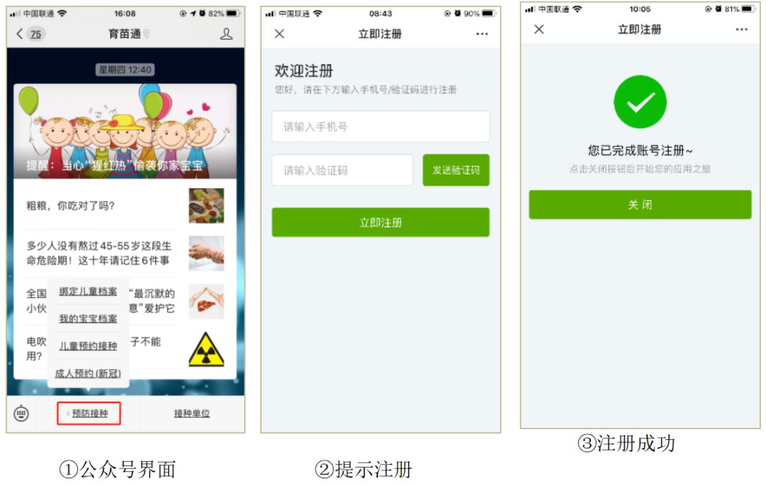 首次进入“育苗通”微信公众号界面点击【预防接种】中任一菜单都会提醒“欢迎注册”,输入手机号后,点击 发送验证码 ,输入验证码后点击 立即注册 。
