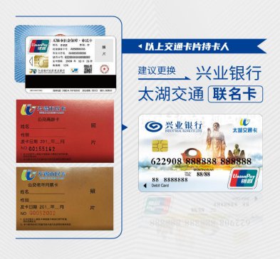 兴业银行太湖交通联名卡集银行金融功能与公共交通功能为一体,免工本费办理,现场取卡,即享受公交6折、地铁95折优惠,并支持加载记名的老龄卡、高龄卡功能,享受年月票乘车优惠。