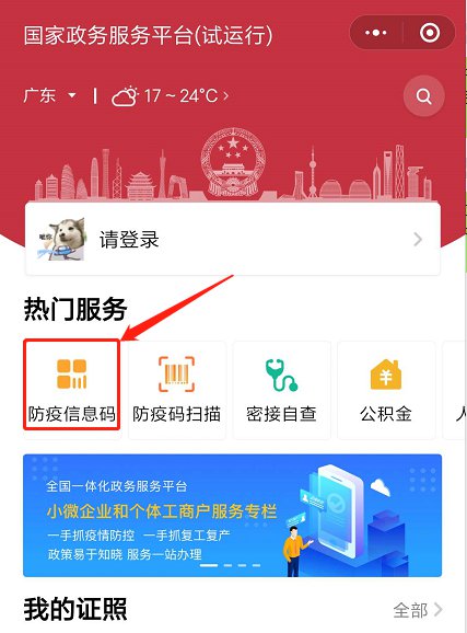 二、进入小程序后,点击进入【申请通道】后,点击如下图红圈圈里面的“防疫信息码”。