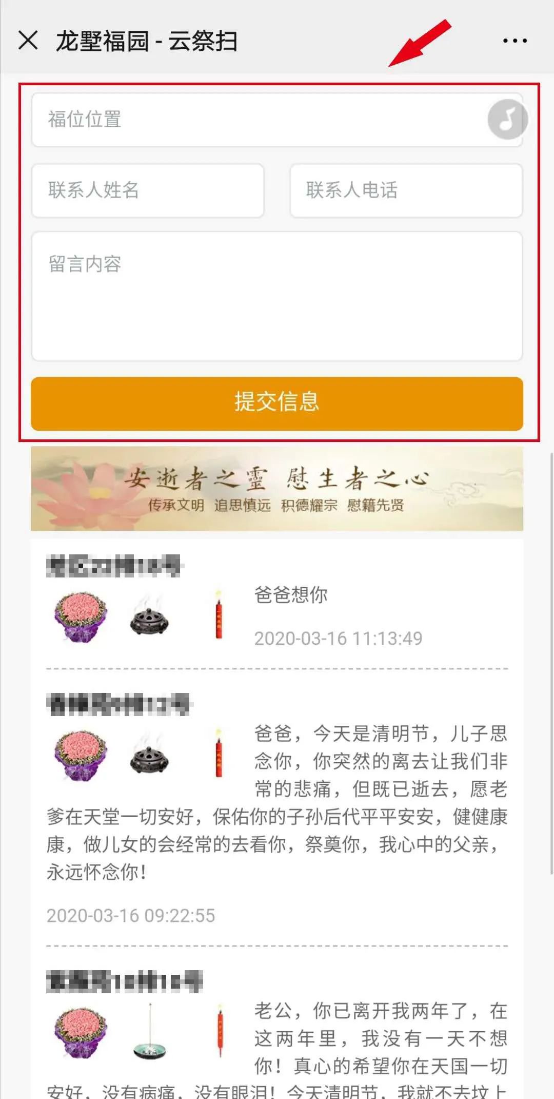 献上各种祭祀物品后,输入基本信息,把想对亲人说的话填入留言内容,点击提交信息。