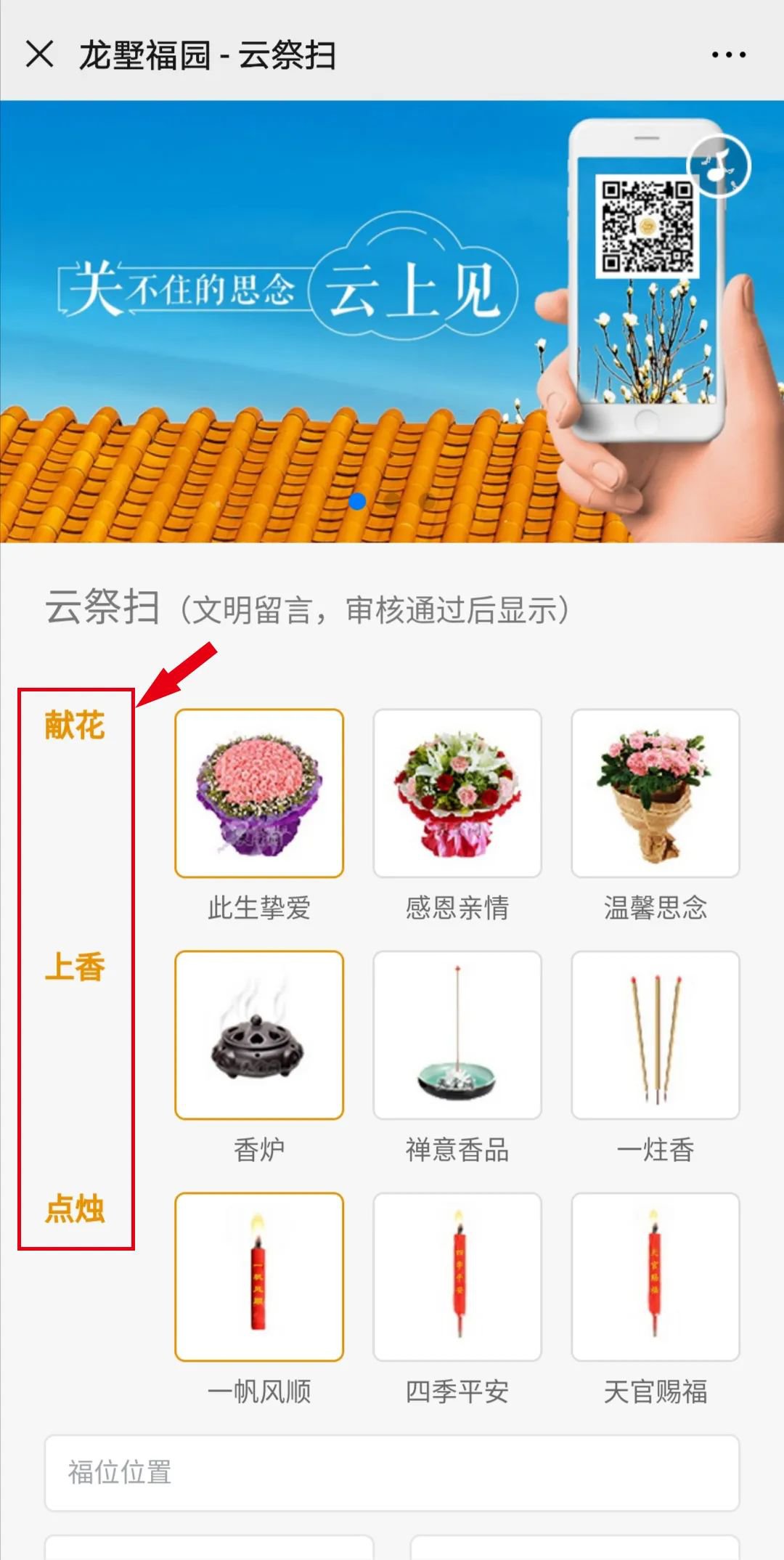 进入微信公众号,点击微信底部菜单栏,“业务办理”,点击进入“云祭扫”(根据红色箭头操作),直接入口:http://www.yx-ls.cn/mob/jisi.php