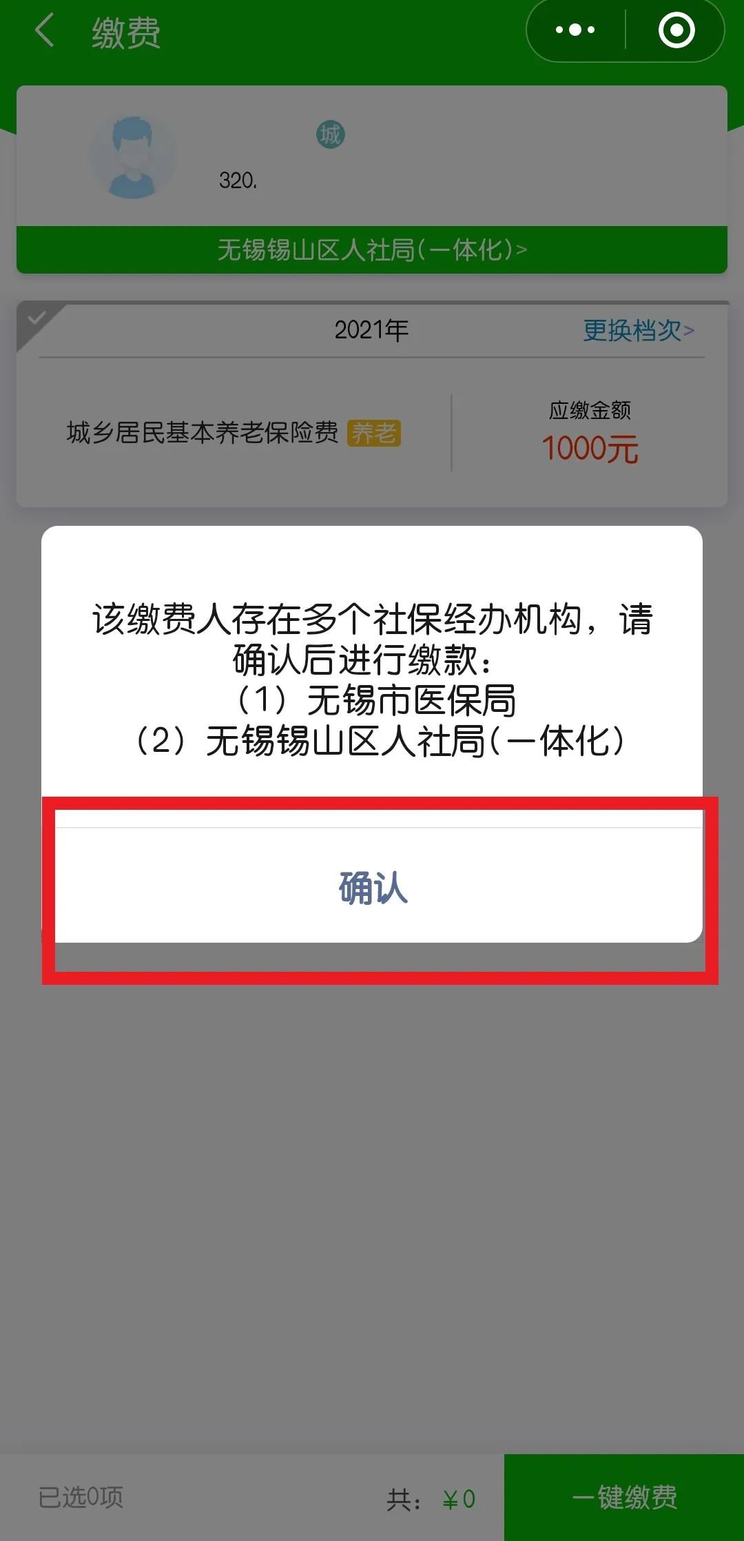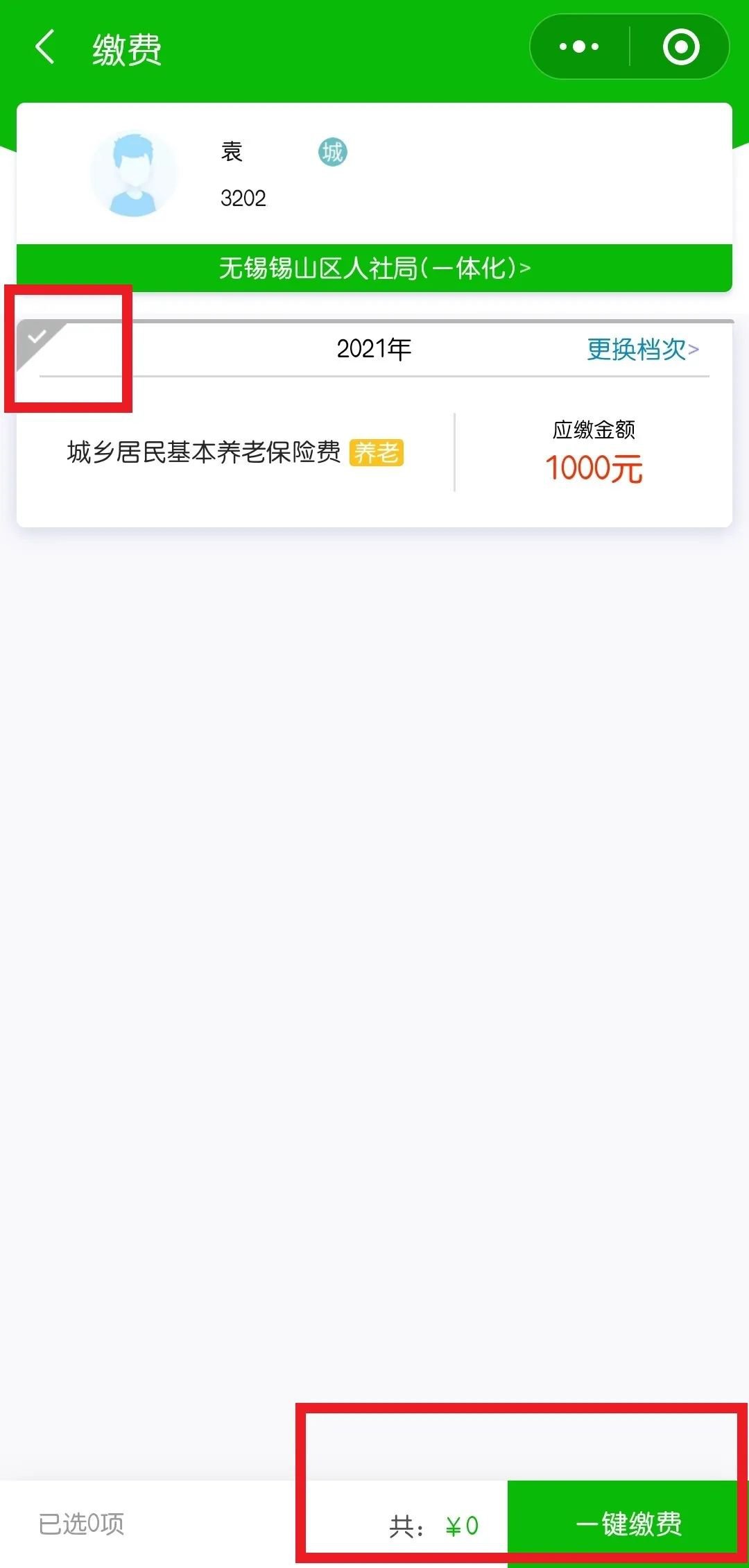 3.选中需缴费人员后,点击查询参保及应缴信息,选择对应的经办机构(城乡居民基本养老保险对应的经办机构为无锡XX区人社局(一体化))。点击【缴费】或【代人缴费】查询出档次信息及待缴费数据,确认待缴数据,勾选并点击【一键缴费】,支付成功即完成缴费。