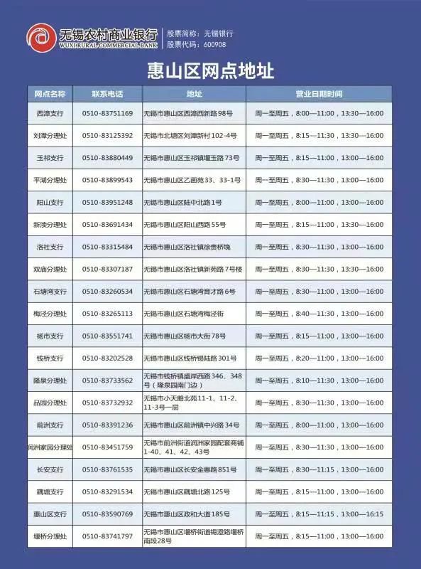 1、无锡农村商业银行惠山区支行(政和大道185号),营业时间:周一至周五,上午8:15至下午16:00.