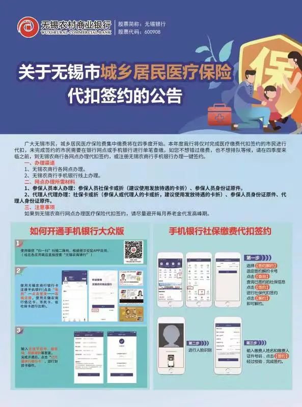城乡居民医疗保险费集中缴费将在四季度开始。2021年度无锡农商行将仅对完成医疗缴费代扣签约的市民进行代扣,未完成签约的市民需要在银行网点或手机银行进行单笔查缴。如您不想错过缴费,也不想排队等候,请在四季度来临之前,到无锡农商行各网点办理代扣签约,或注册无锡农商行手机银行办理一键签约。