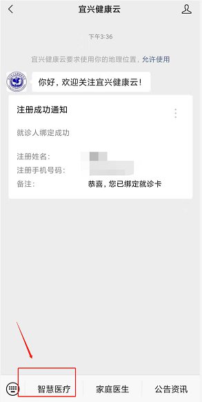 一、微信搜索并关注公众号“宜兴健康云”,点击“智慧医疗”菜单栏