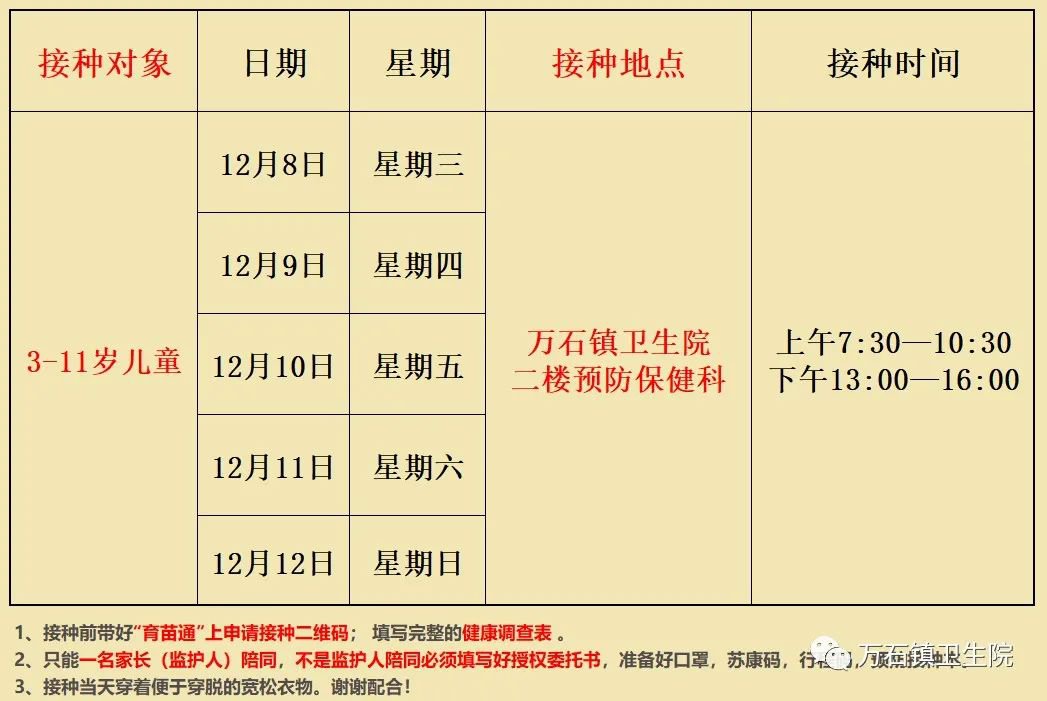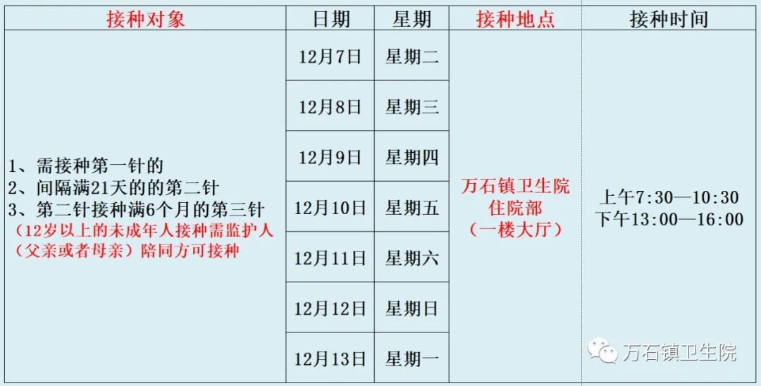 12月7日—12月13日万石镇新冠疫苗接种安排如下: