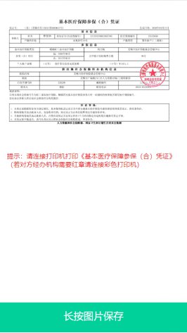 第七步:生成《基本医疗保障参保(合)凭证》图片,长按图片保存,连接打印机打印此凭证。